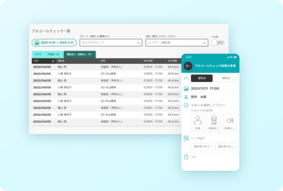 車両を使用する企業にとって必須である運転前後のアルコールチェックにおいて、簡単に記録、そして保管を実現します。